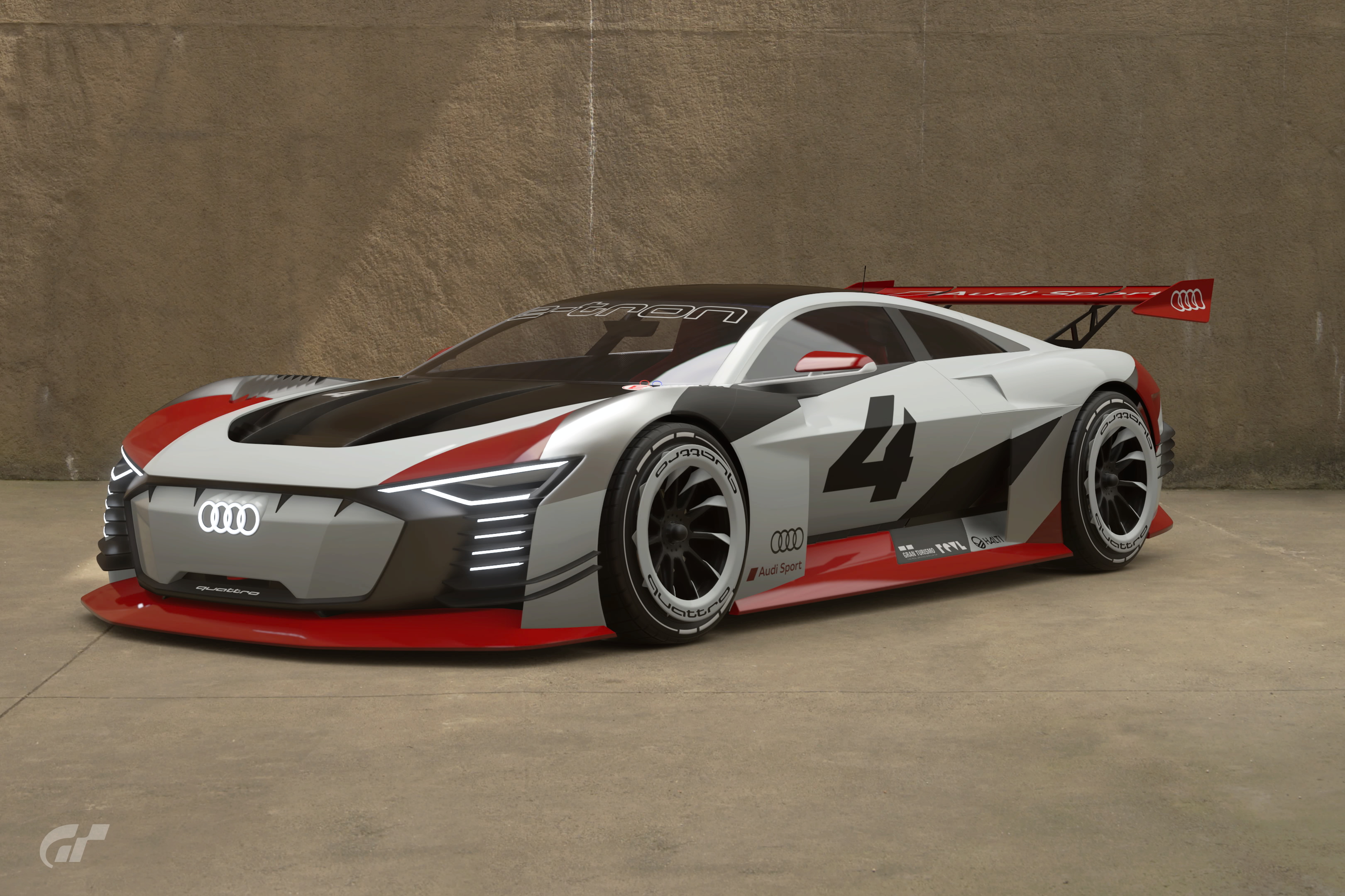 - "The Audi e-tron Vision Gran Turismo is a fully electric version of the original Audi VGT. Its unique styling is the work of Audi Design, the company's in-house design department. The body graphics are inspired by those from the classic Audi 90 GTO. With one motor at the front axle and two at the rear, it was AWD with a total power output of 803.7 HP. The Audi race team loved this design study so much, they even went as far as to build one in real life!"