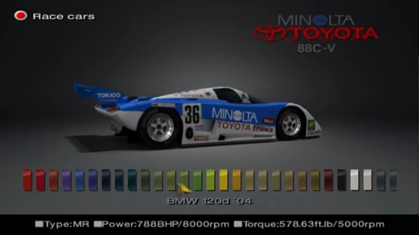 Curiously, if the second car has less color options than the first, it is possible to see a "BMW 120d '04" text as a placeholder if the player scrolls the list of colors to the very right.