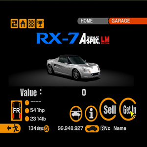 - Because the car also uses the parameters of the Mazda RX-7 A-Spec LM Edition, the specifications are derived from that car, and only racing tyres can be installed. Additionally, viewing the specifications of the car also reflects the RX-7 A-Spec LM Edition's spec sheet.