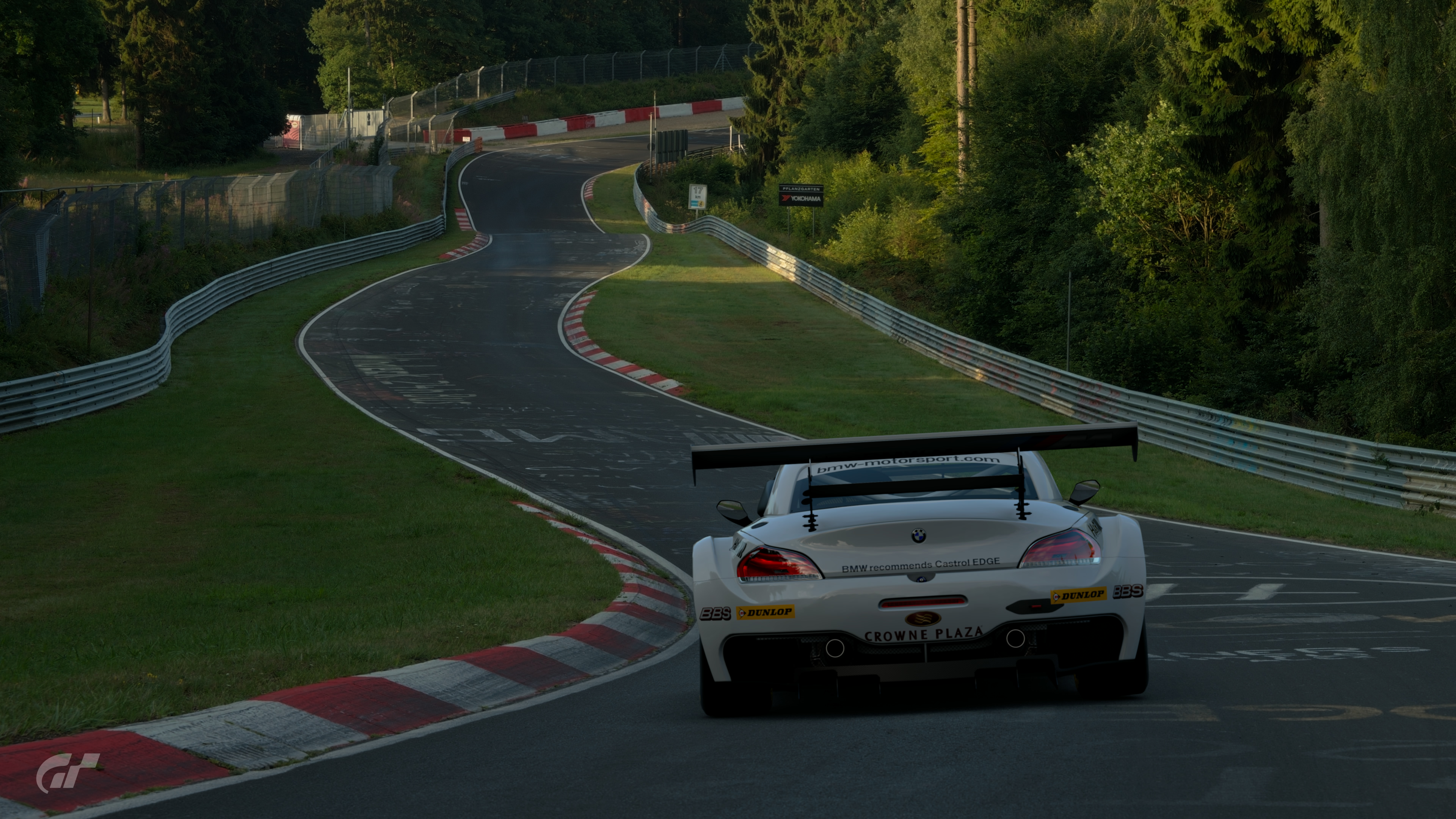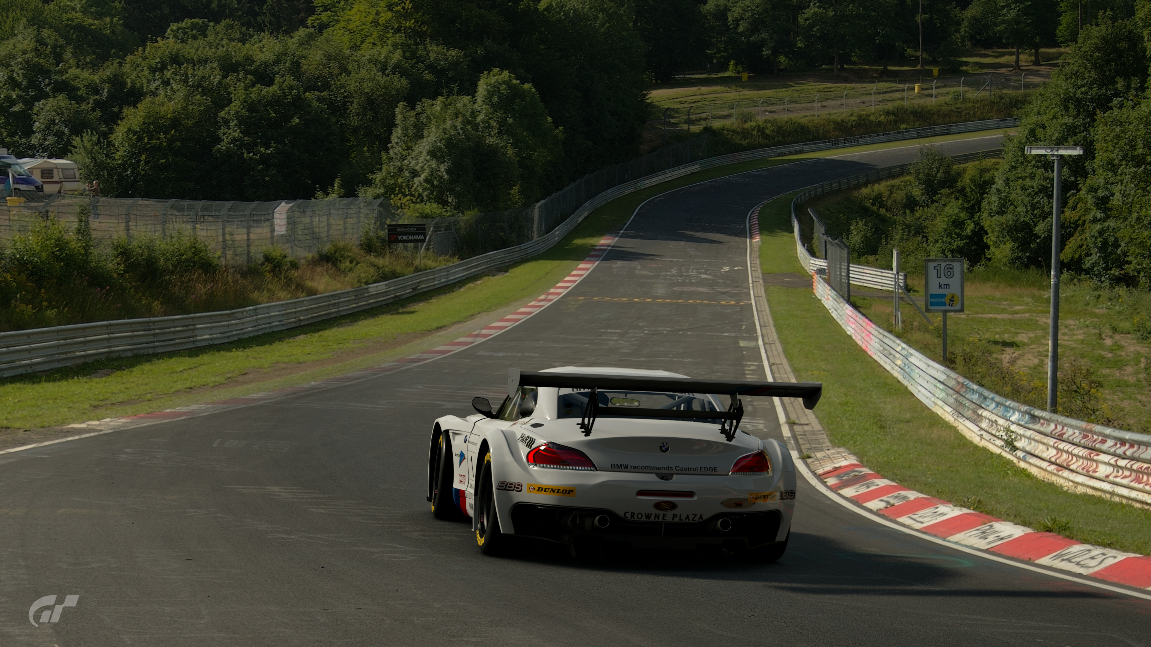 For Eschbach, pass through the first left corner at partial throttle. Keep to the inside as you turn, and follow along the next left side kerbstones to clear the corner. Brünnchen is a famous section where there is a large camping site on the side of the track. Because of the first corner descent, you are prone to understeer here. Use the wide flat outer kerbstones to raise your turning speed. The second right hand corner is uphill. Brake using the sign on the left as your cue and turn in. Clip the apex at the far end of the corner, and use the full width of the track to exit the corner.