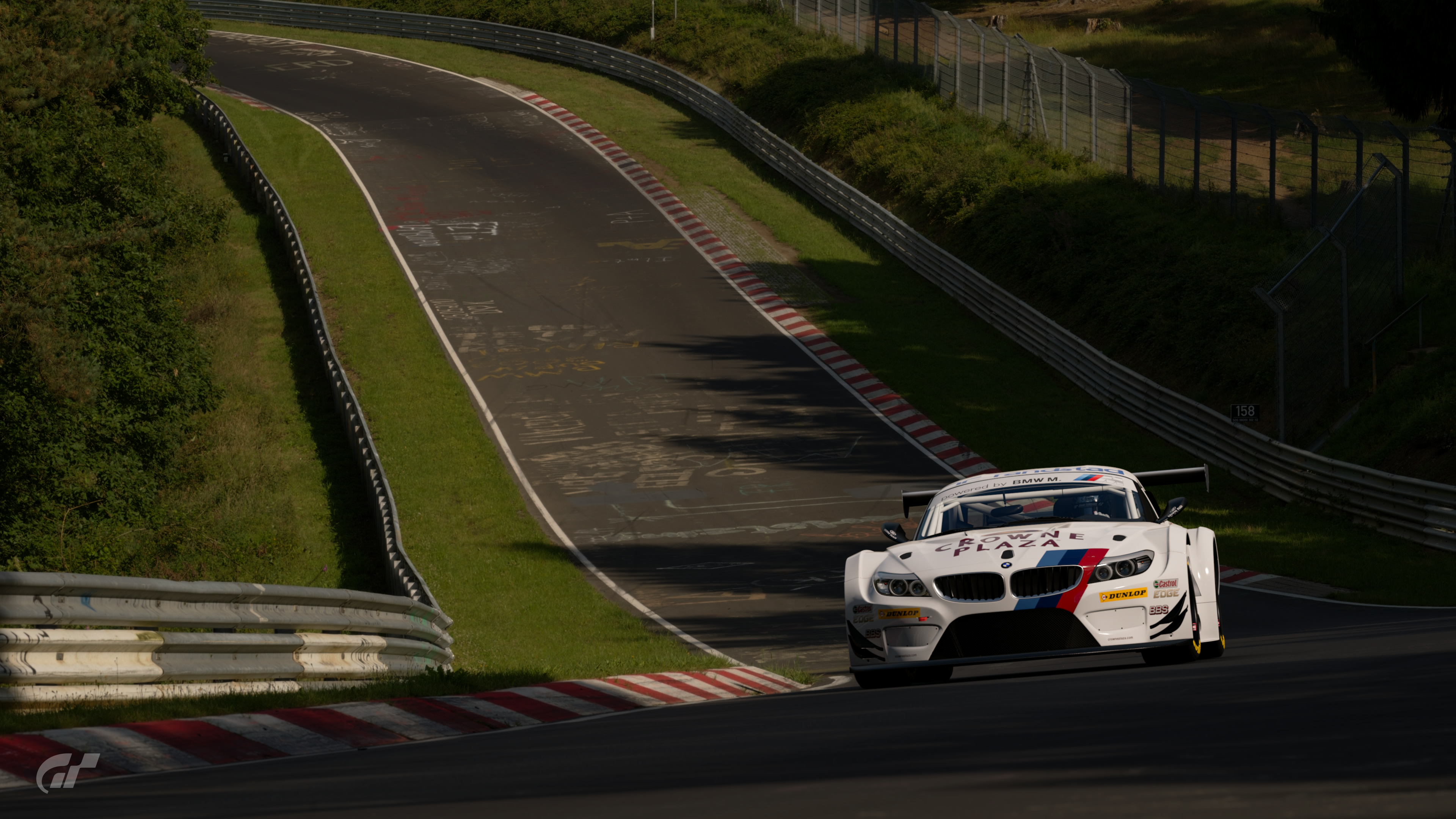 Bergwerk is a difficult corner that turns to the right on a climb, and becomes tighter further into the corner. Start braking before the sign on the left, keeping a middle line in the first half of the corner, and setting the apex where you see red graffiti on the ground, make your exit.